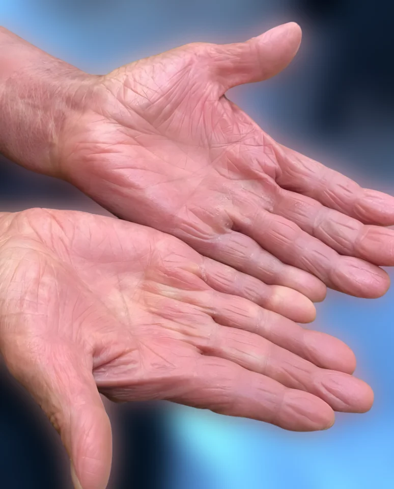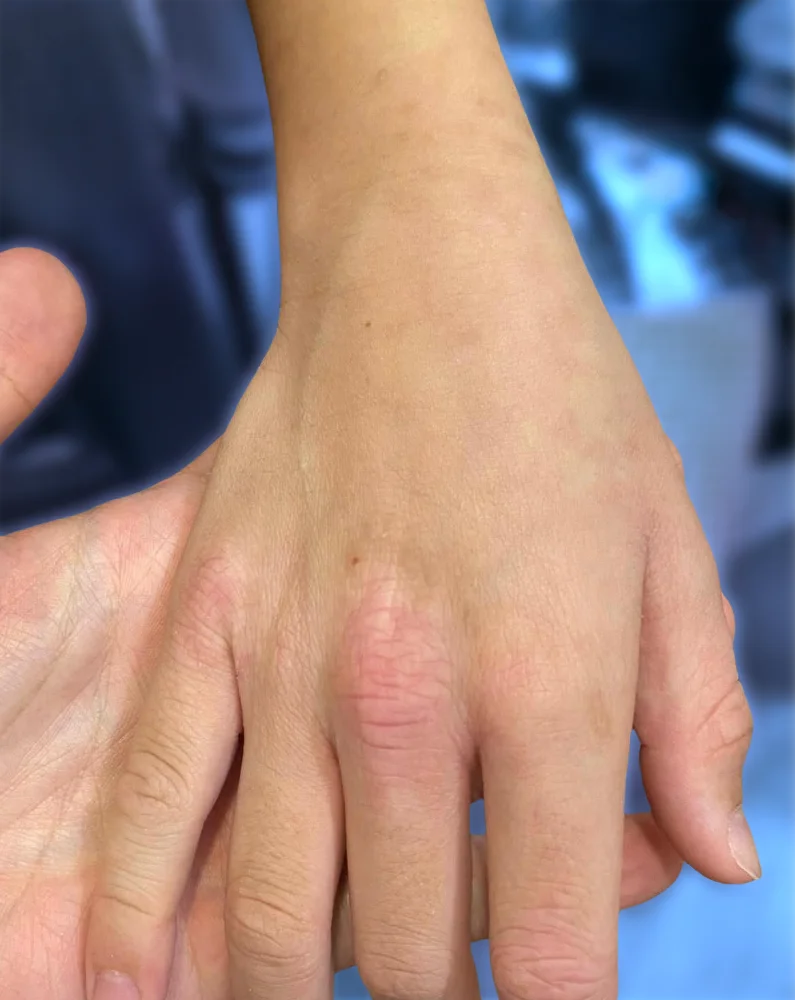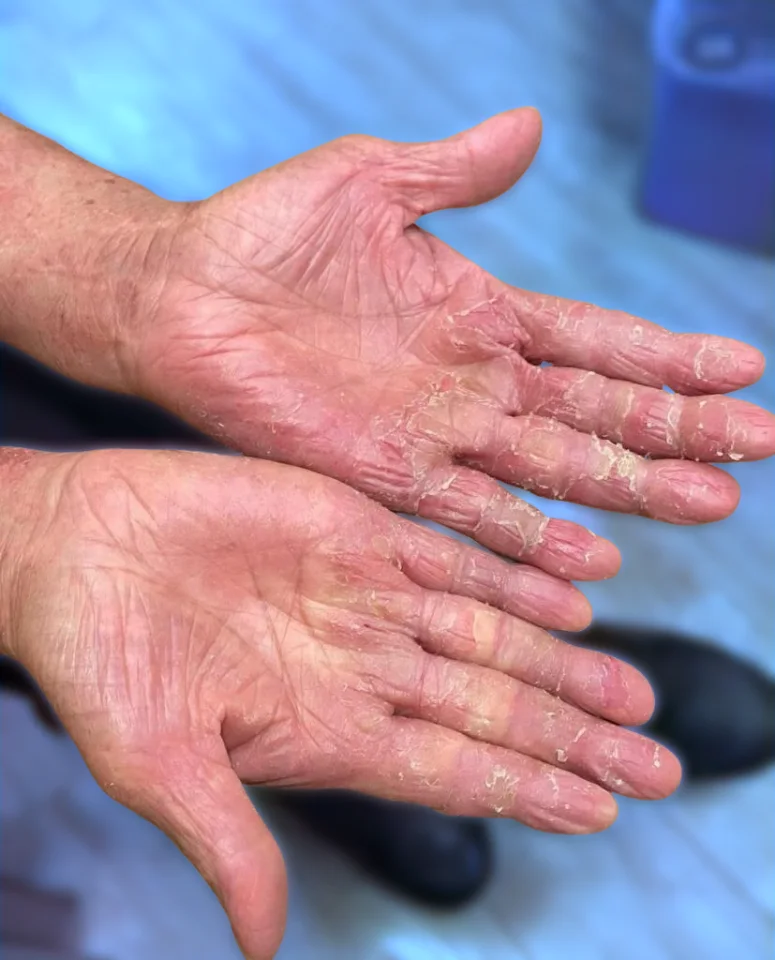 患者於2024年4月22日就診,主訴雙手手掌乾燥已持續約4個月。期間曾接受中西醫治療,惟療效未見顯著。伴隨症狀包括手腕出現紅疹,手掌無明顯痕癢,但有嚴重脫皮情況。雙足未見異常。